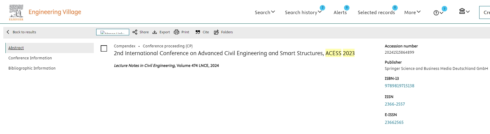 ACESS 2023 all accepted papers were published by Springer Book Series 'Lecture Notes in Civil Engineering (volume 474; ISSN: 2366-2557). The proceedings have also been successfully indexed in EI and Scopus, and other leading academic databases.